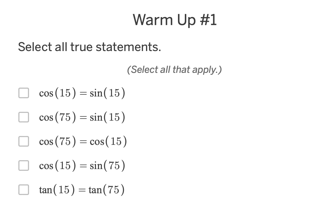 Below is an example of this type of entry level task from my classroom. Students have access to calculators so even if they forget the rule that the angles must add to 90 degrees, they could figure it out by typing each equation into the calculator to see which ones are equivalent. This Warm Up was for a lesson about angles of elevation and depression where it is helpful to take advantage of this rule.